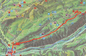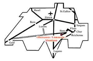 | In Ilanz folgen Sie der Beschilderung unmittelbar nach der Rheinüberquerung rechts (1) nach Obersaxen und biegen nach etwa 300 m wiederum rechts ab. Nach etwa 1 km (2) wiederum rechts abbiegen. Dieser Strasse folgen Sie über Flond und Valata bis 300 m nach dem Ortsende (Tankstelle) von Obersaxen-Affeier (3). Dort biegen sie links nach Misanenga/Cresta ab und fahren den Berg hoch. In Misanenga biegen Sie an der ersten Abzweigung (4) links ab, dem Schild "Cresta" folgend. Nach etwa 200 m fahren Sie links abwärts zum Hotel "Panarama" und unmittelbar rechts in die Walsersiedlung "Cresta". |  |
