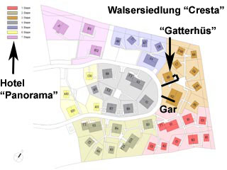Das Chalet "Gatter Hüs" liegt quasi am Scheitel der Siedlungsstrasse. Die Wohnung befindet sich über die Treppe abwärts in Parterre auf der zur Strasse abgewandten Seite. Die Garage mit dem Stellplatz 11 befindet sich unter dem Nachbarhaus.